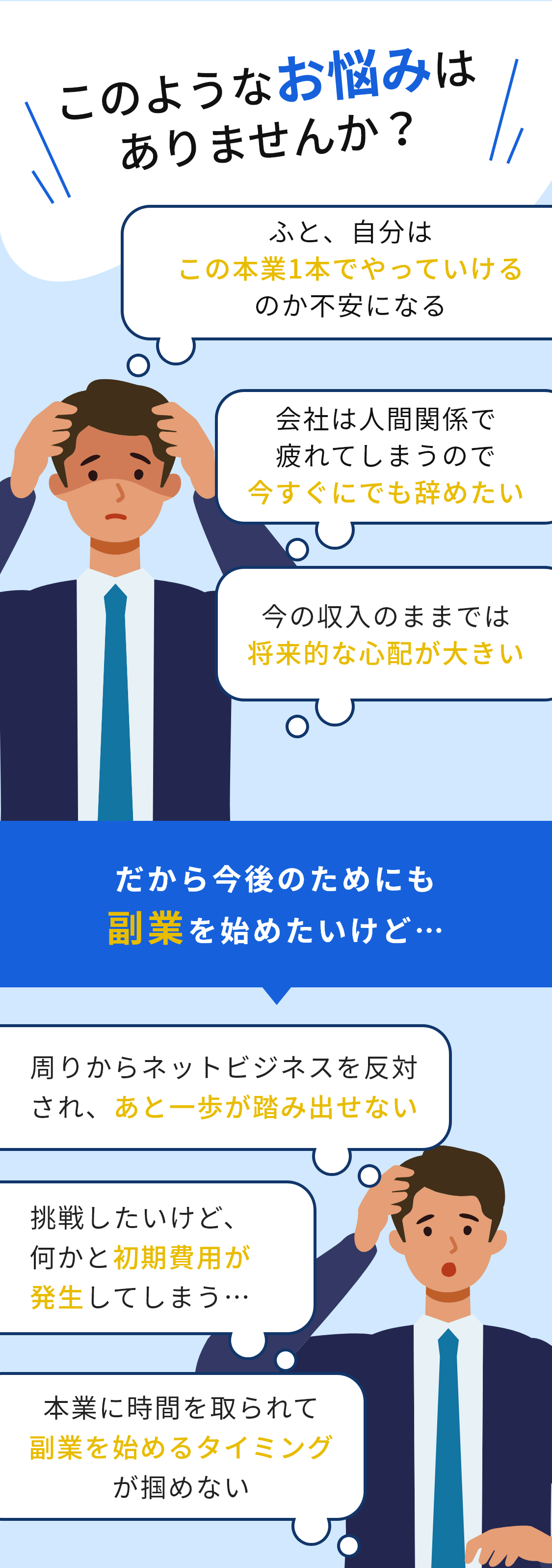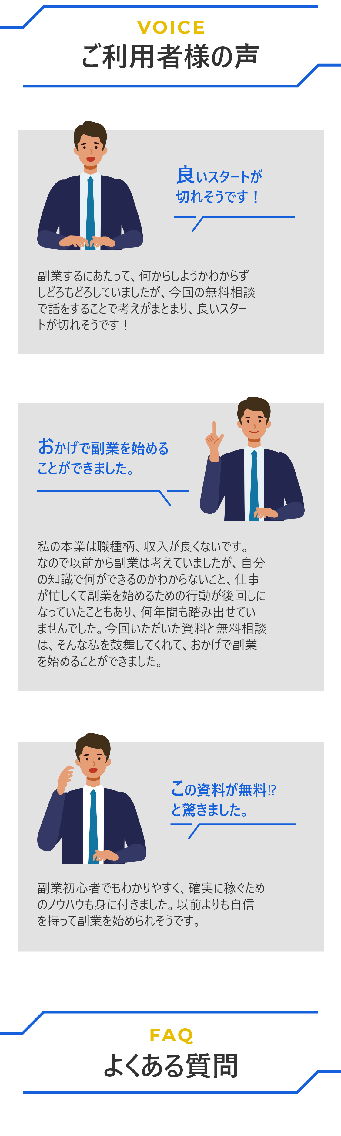 A.副業をしたことがない方、一度副業で失敗している方、副業を本業にしたい方、副業で自分ビジネスを始めたい方…。 どのような方にもご利用いただけるコンテンツとなっています。